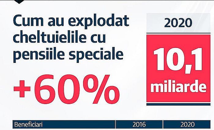In perioada 2016-2020, cheltuielile cu toate pensiile date prin legi speciale au crescut cu 60%. Un procent semnificativ. Pensiile ajung la niveluri exorbitante, de invidiat chiar si pentru cetateni ai celor mai bogate tari de pe glob: 78.000 de lei pe luna, adica 16.000 de euro pe luna.
