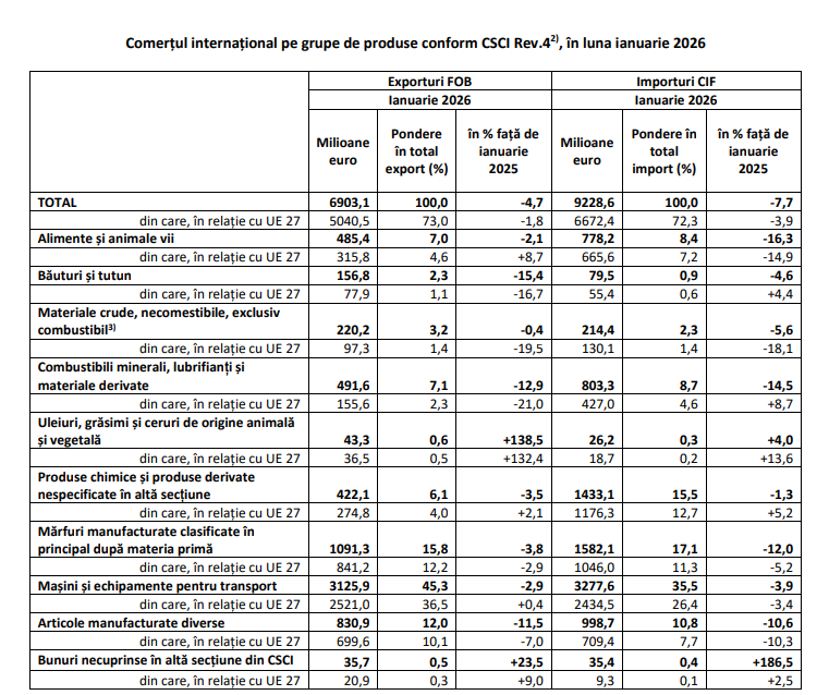 In luna ianuarie 2026, exporturile au insumat 6,903 miliarde euro, iar importurile 9,228 miliarde euro. Fata de luna ianuarie 2025, exporturile din luna ianuarie 2026 au scazut cu 4,7%, iar importurile au scazut cu 7,7%.