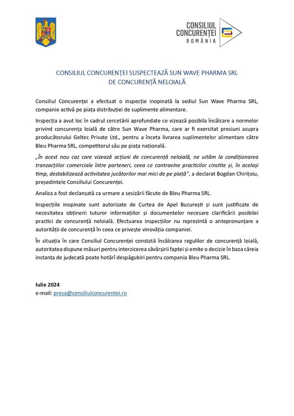 “Consiliul Concurentei a efectuat o inspectie inopinata la sediul Sun Wave Pharma SRL, companie activa pe piata distributiei de suplimente alimentare. Inspectia a avut loc in cadrul cercetarii aprofundate ce vizeaza posibila incalcare a normelor privind concurenta loiala de catre Sun Wave Pharma, care ar fi exercitat presiuni asupra producatorului Geltec Private Ltd., pentru a inceta livrarea suplimentelor alimentare catre Bleu Pharma SRL, competitorul sau pe piata nationala: