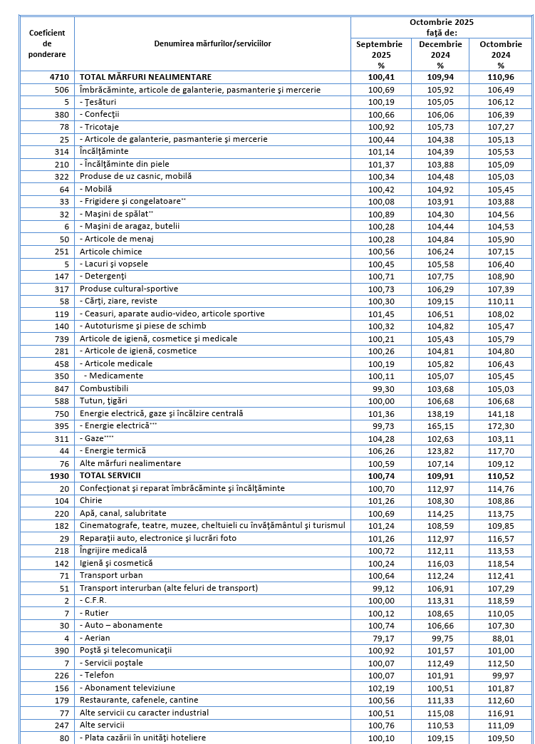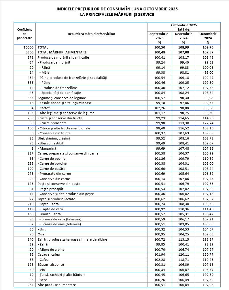 Rata anuala a inflatiei in luna octombrie 2025 comparativ cu luna octombrie 2024 a fost 9,8%. In septembrie era 9,9%. Cifrele Institutului National de Statistica (INS) arata ca indicele preturilor de consum in luna octombrie 2025 comparativ cu luna septembrie 2025 a fost 100,50%. Rata inflatiei de la inceputul anului (octombrie 2025 comparativ cu decembrie 2024) a fost 9,0%. Rata medie a modificarii preturilor de consum in ultimele 12 luni (noiembrie 2024 – octombrie 2025) fata de precedentele 12 luni (noiembrie 2023 – octombrie 2024) a fost 6,6%.