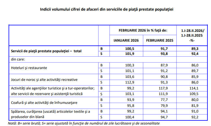 In perioada 1.I-28.II.2026, volumul cifrei de afaceri din serviciile de piata prestate populatiei a scazut fata de perioada 1.I-28.II.2025, atat ca serie bruta cu 10,7%, cat si ca serie ajustata in functie de numarul de zile lucratoare si de sezonalitate cu 7,6%.