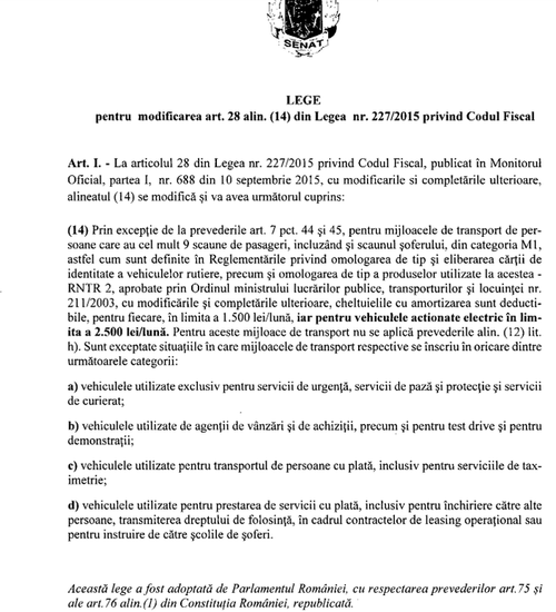 Proiectul vizeaza modificarea Codului fiscal si majorarea sumei lunare ce reprezinta cheltuielile cu amortizarea masinilor, de la 1.500 lei/luna asa cum este stabilit in momentul de fata, la 2.500 lei/luna pentru vehiculele electrice. Conform actualelor prevederi din Codul Fiscal, posesorii de autovehicule electrice nu au posibilitatea de a deduce cheltuielile cu combustibilul lunar, iar pentru a crea un cadru legal echilibrat este necesar ca plafonul cheltuielilor lunare cu amortizarea unui autovehicul electric sa fie majorat, arata initiatorii.