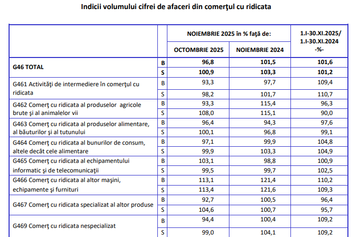 In perioada ianuarie-noiembrie 2025, cifra de afaceri din comertul cu ridicata (cu exceptia comertului cu autovehicule si motociclete), a crescut fata de perioada similara din 2024, atat ca serie bruta cu 1,6%, cat si ca serie ajustata in functie de numarul de zile lucratoare si de sezonalitate cu 1,2%.