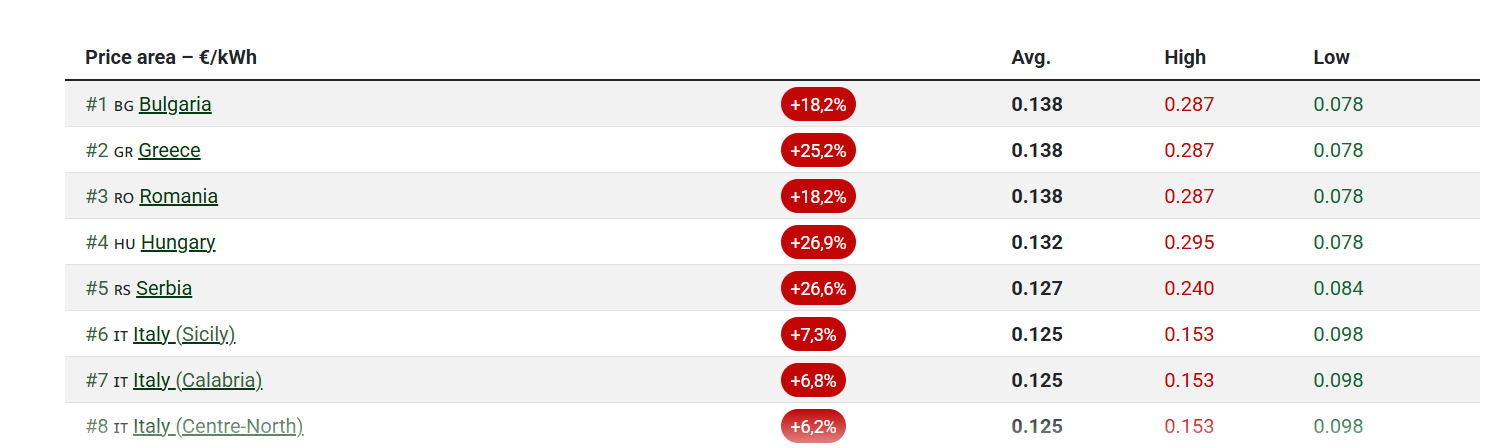 Romania se situeaza vineri, 31 octombrie 2025, in top 3 in Uniunea Europeana in ceea ce priveste pretul la energie electrica. Este la egalitate cu Bulgaria si Grecia, cu un pret de 0,138 /kWh, potrivit energyprices.eu.