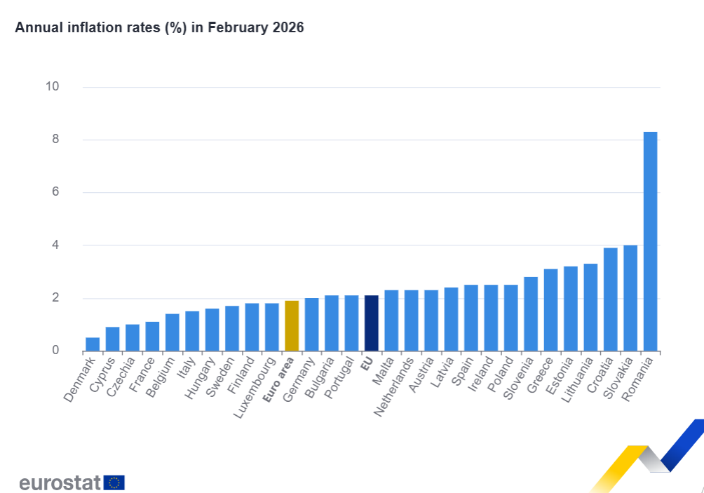 Rata anuala a inflatiei in zona euro a fost de 1,9 % in februarie 2026 , in crestere fata de 1,7% in ianuarie . Cu un an mai devreme, rata era de 2,3 %. Inflatia anuala in Uniunea Europeana a fost de 2,1 % in februarie 2026 , in crestere fata de 2,0% in ianuarie . Cu un an mai devreme, rata era de 2,7 %.