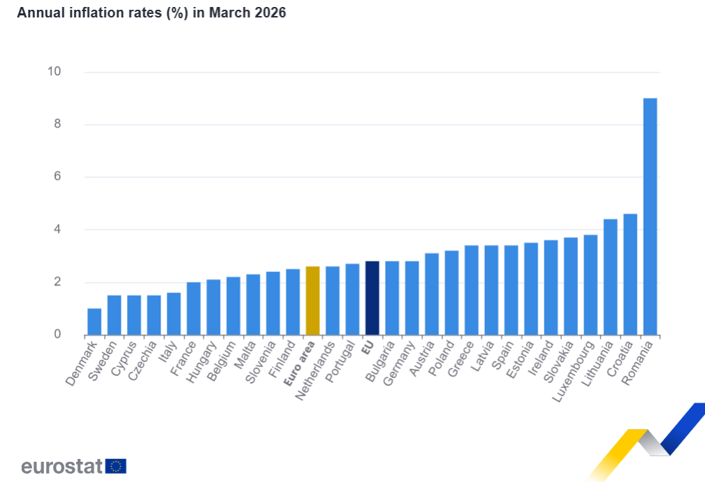 Rata anuala a inflatiei in zona euro a fost de 2,6 % in martie 2026 , in crestere fata de 1,9% in februarie . Cu un an mai devreme, rata era de 2,2 %. Inflatia anuala in Uniunea Europeana a fost de 2,8 % in martie 2026 , in crestere fata de 2,1% in februarie . Cu un an mai devreme, rata era de 2,5 %.