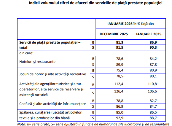 In ceea ce priveste serviciile de piata prestate populatiei, serie bruta, in luna ianuarie 2026, fata de luna precedenta, volumul cifrei de afaceri a inregistrat o scadere cu 18,7%, ca urmare a scaderilor inregistrate la activitatile de jocuri de noroc si alte activitati recreative (-24,6%), activitatile hotelurilor si restaurantelor (-21,4%), serviciile de coafura si alte activitati de infrumusetare (-21,2%) si la activitatile de spalare si curatare (uscata) a articolelor textile si a produselor din blana (-15,0%).